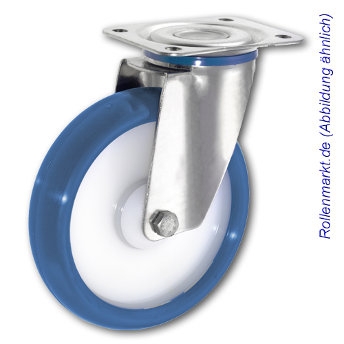 Edelstahl-Lenkrolle mit blauem Polyurethanrad 80 mm und Plattenbefestigung